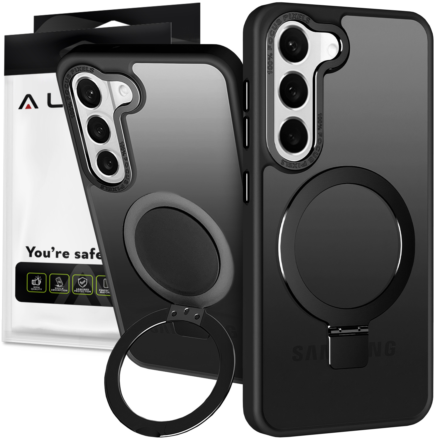 Etui na telefon od marki Alogy posiada magnetyczny ring, który po rozłożeniu może służyć również jako podstawka.